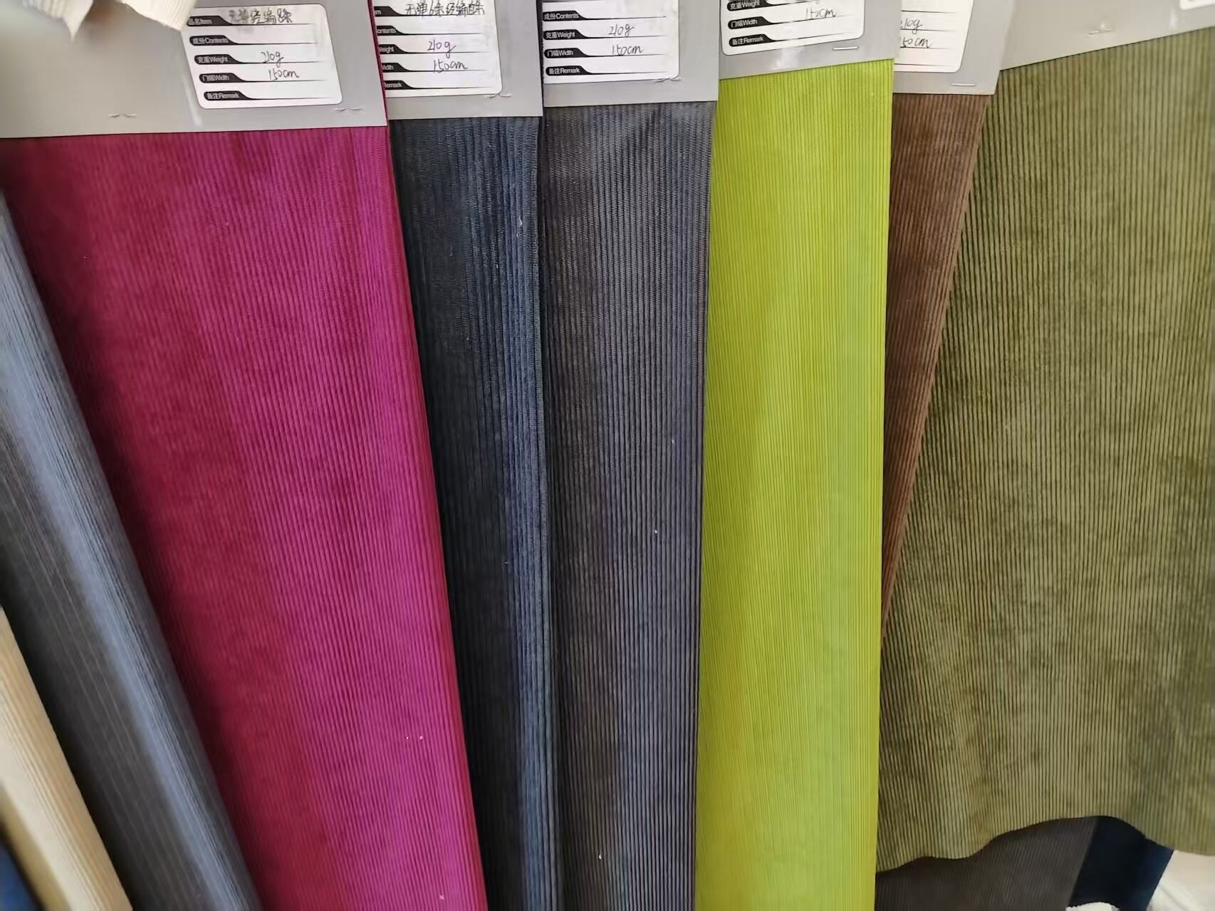 Mengikut ciri tenunan korduroi, benang pakan kasar, sederhana, halus dan jaket kain korduroi mentah yang terapung akan dipotong untuk proses pengeluaran seterusnya.