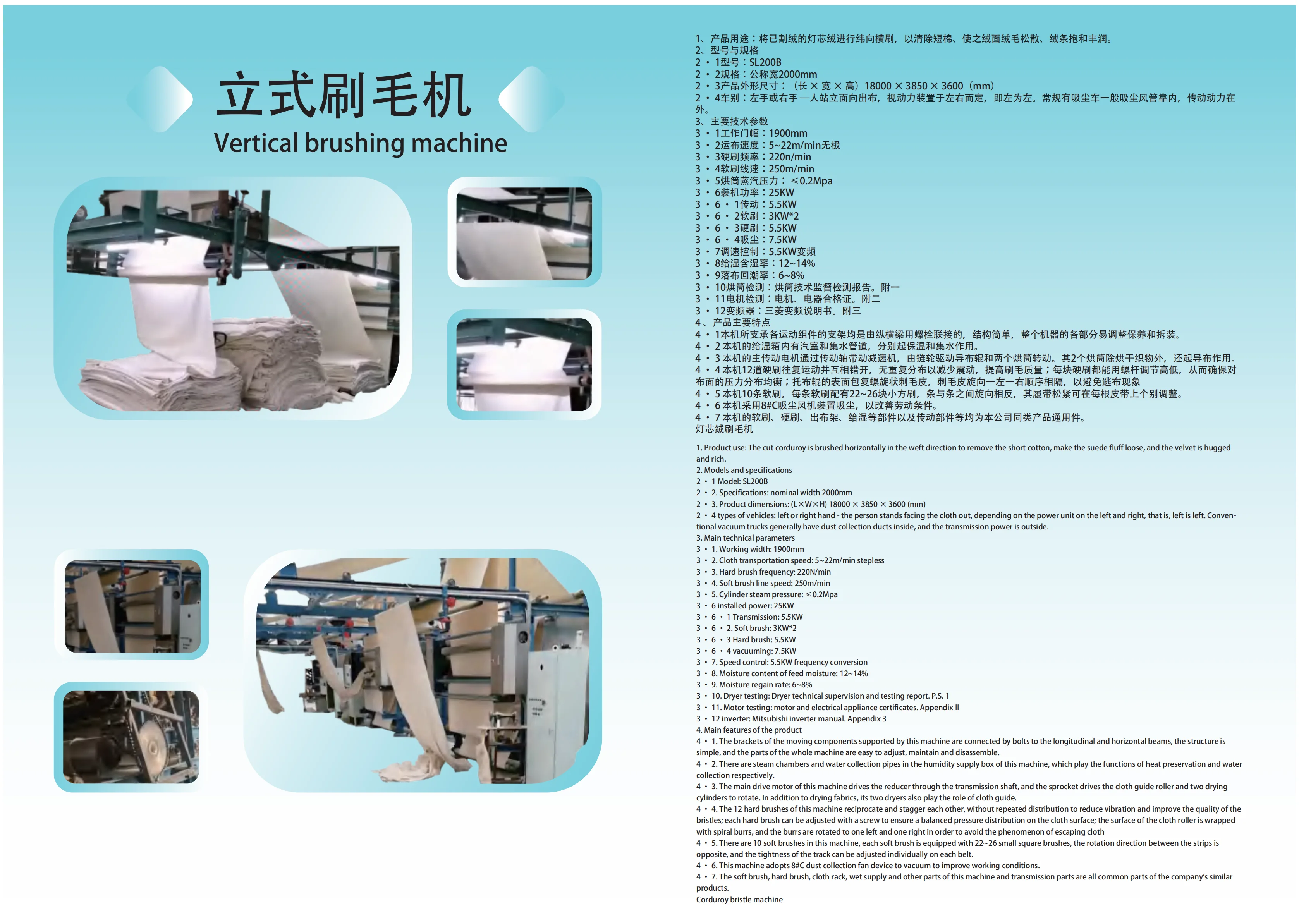 bristles; each hard brush can be adjusted with a screw to ensure a balanced pressure distribution on the cloth surface; the surface of the cloth roller is wrapped